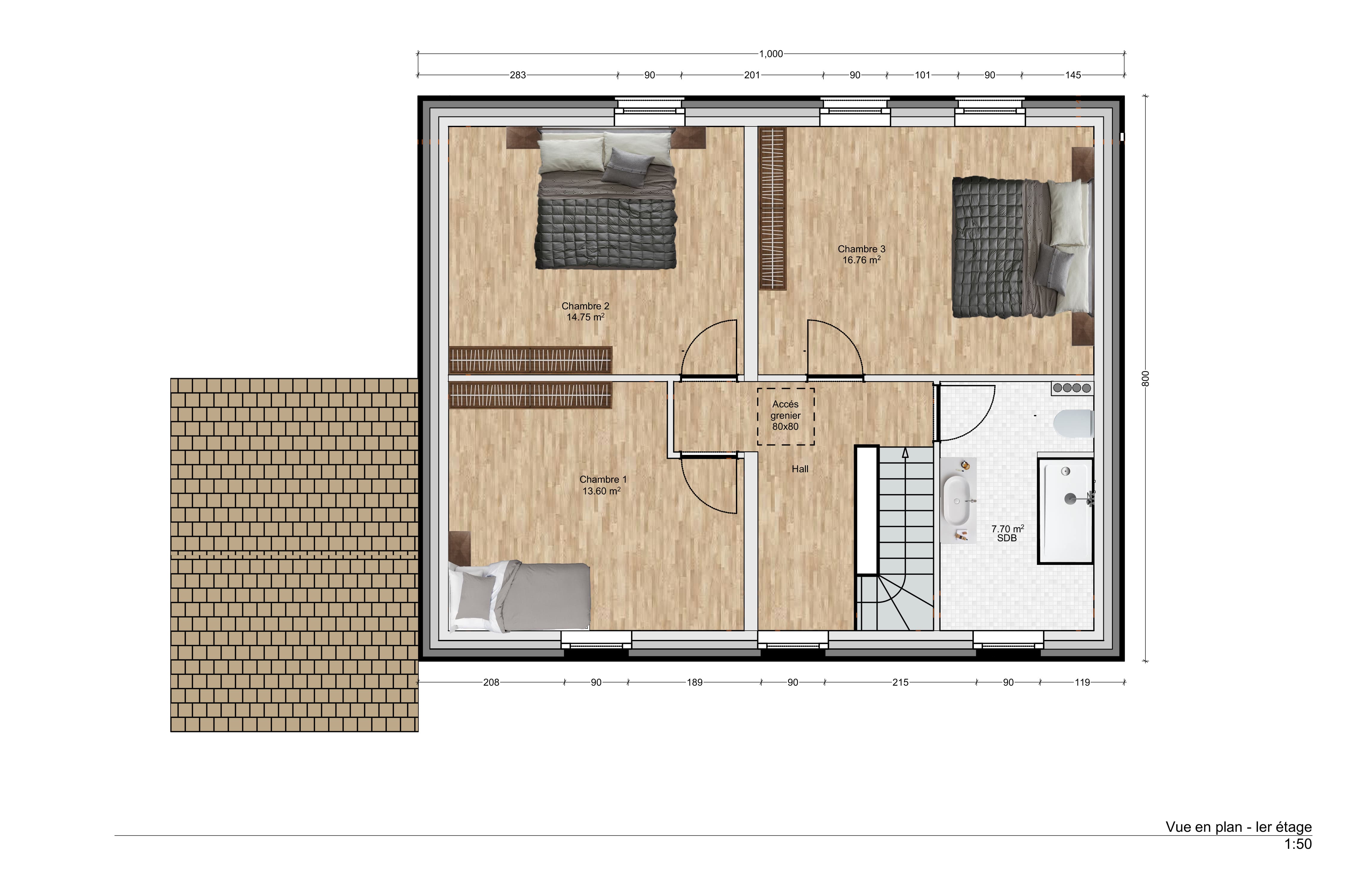 Verdieping: Nachthal met een kleine werkruimte, 3 slaapkamers, badkamer (inloopdouche, meubel, hangend toilet).