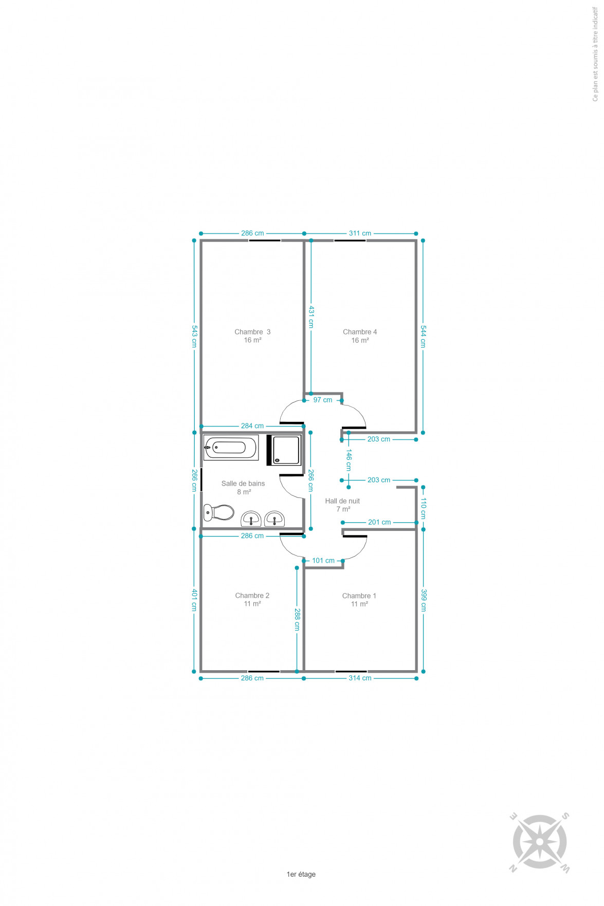 Eerste verdieping: Nachthal, badkamer (bad + douche), 4 slaapkamers en kleine opslagruimte onder het dak via een luik.