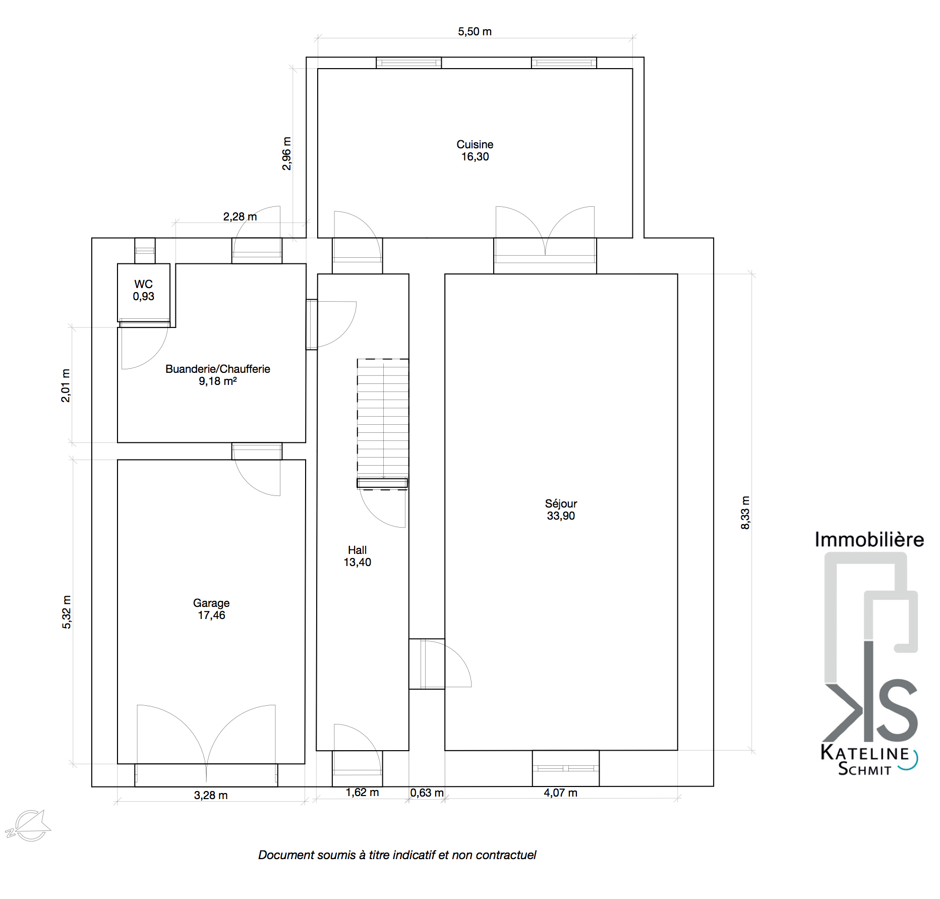 Rez-de-chaussée : Hall d'entrée, séjour de 34m2, cuisine semi-équipée, buanderie/chaufferie, wc, garage.