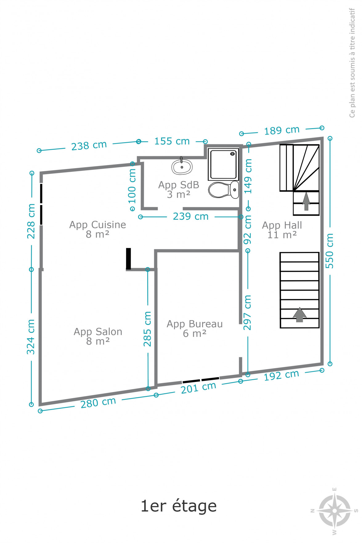 1er étage : deux pièces à aménager (living avec cuisine ouverte et bureau/chambre/salon) + salle de douche