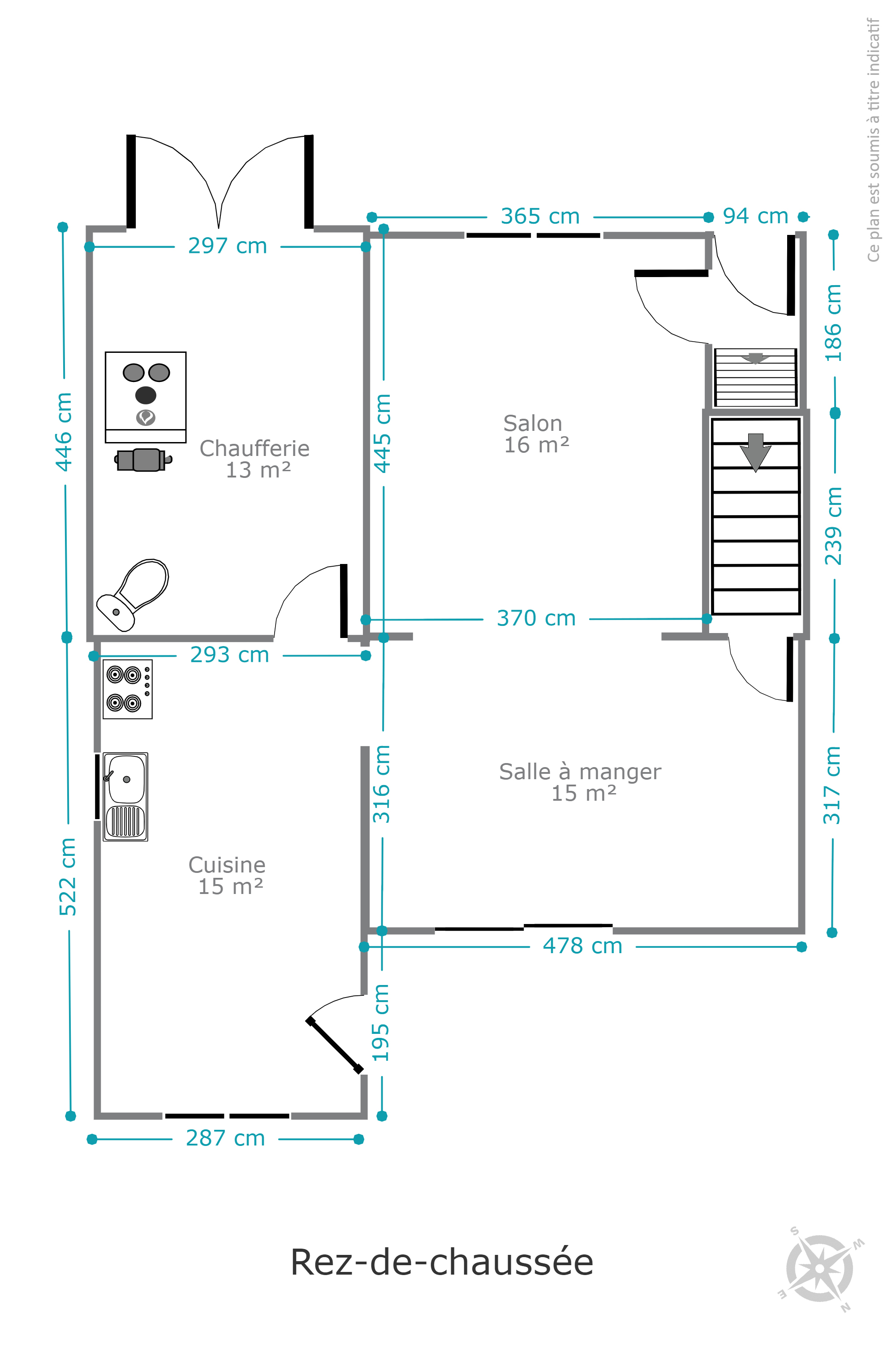 - Rez-de-chaussée : Hall d’entrée, séjour lumineux, cuisine équipée, toilette, chaufferie/buanderie, terrasse
