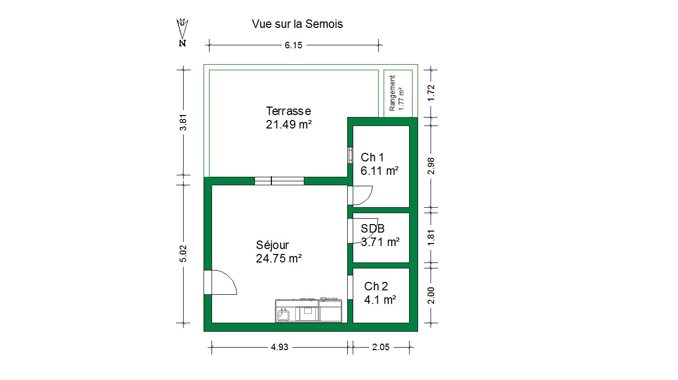 Beau séjour (24m²) avec cuisine équipée ouverte, 2 chambres (6m² - 4m²), 1 salle de bains (douche, lavabo, wc, nouveau boiler). Agréable terrasse (avec rangement) de 21m².