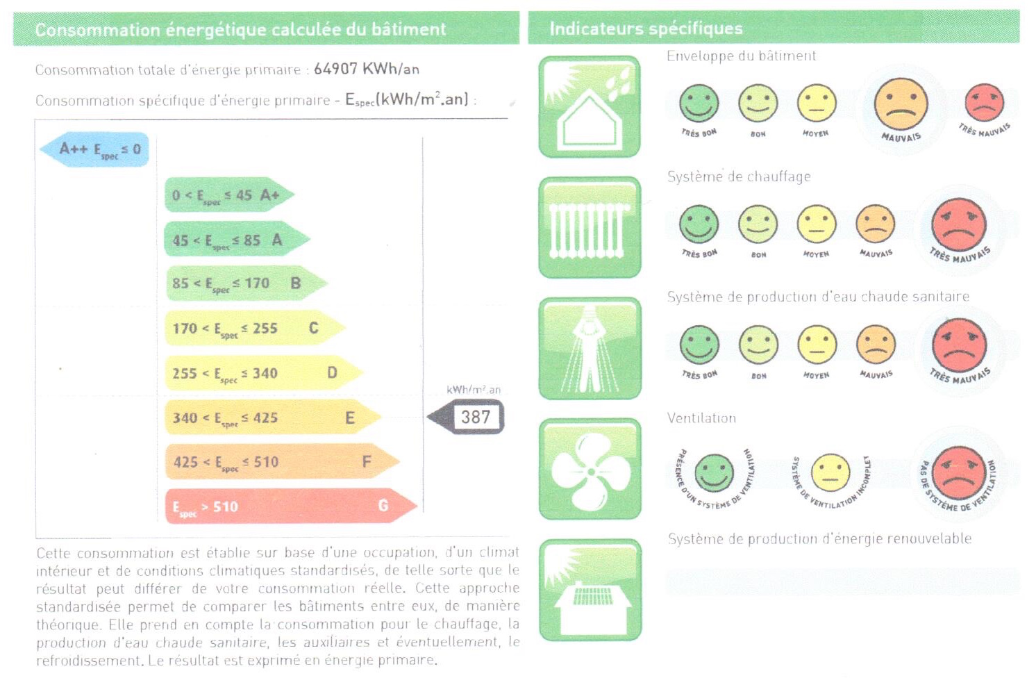 Consommation spécifique d'énergie primaire : 387 kWh/m²a