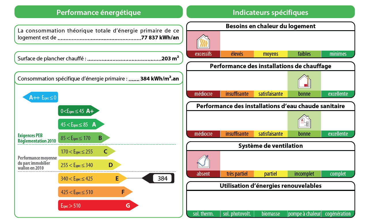 Consommation spécifique d'énergie primaire : 384 kWh/m²a
